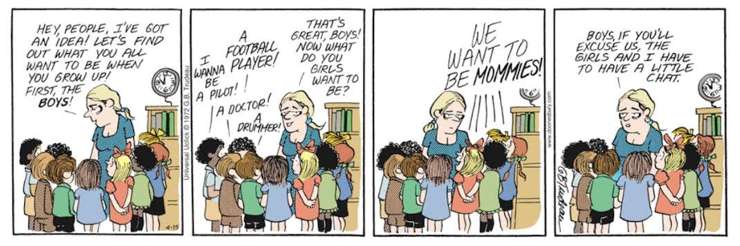But I suspect a lot of journalists (and headline writers) came up in the age when career or family were presented in the academy as sort of an either-or proposition. To be fair, it follows in the wake of the 1950s culture, where opportunities for women were less celebrated, and she lives in the world of Gary Trudeau’s character, Joanie Caucus. If you don’t remember her, she’s Joanie Caucus – MS. Joanie Caucus, who taught at the Walden Daycare. In the famous comic below, she addressed the children: