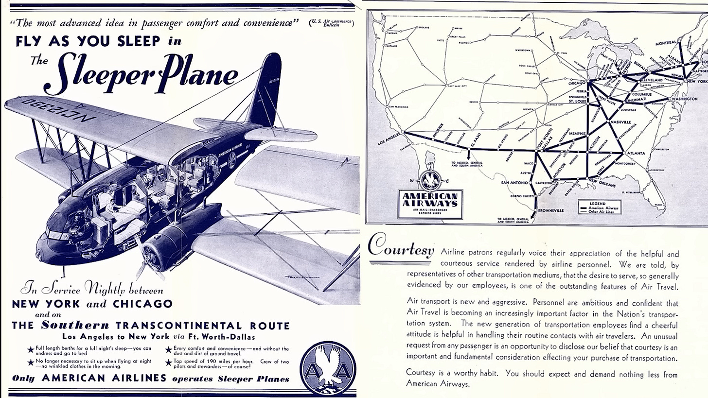 Today’s luxury suites in aircraft (often shown in videos by Will Davis) [1.] actually have their beginnings in the 1930s when American Airlines flew transcontinental sleeper service on Curtiss Condor II airplanes. American Airlines CEO C. R. Smith wanted to replace the Condor II biplanes with Douglas DC-2 monoplanes. There was a problem, however, as the DC-2’s cabin was only 66 inches wide – too narrow for side-by-side berths.