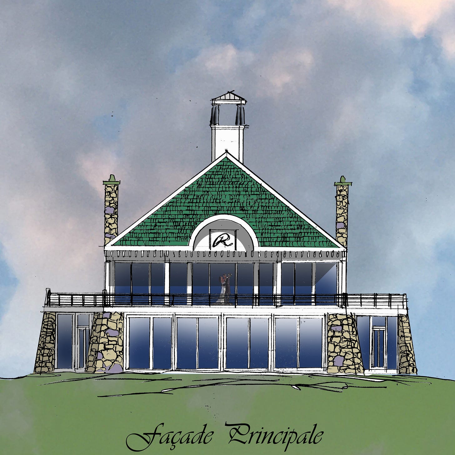 The building nestles into a low valley. — Drawing by Bob Kirchman