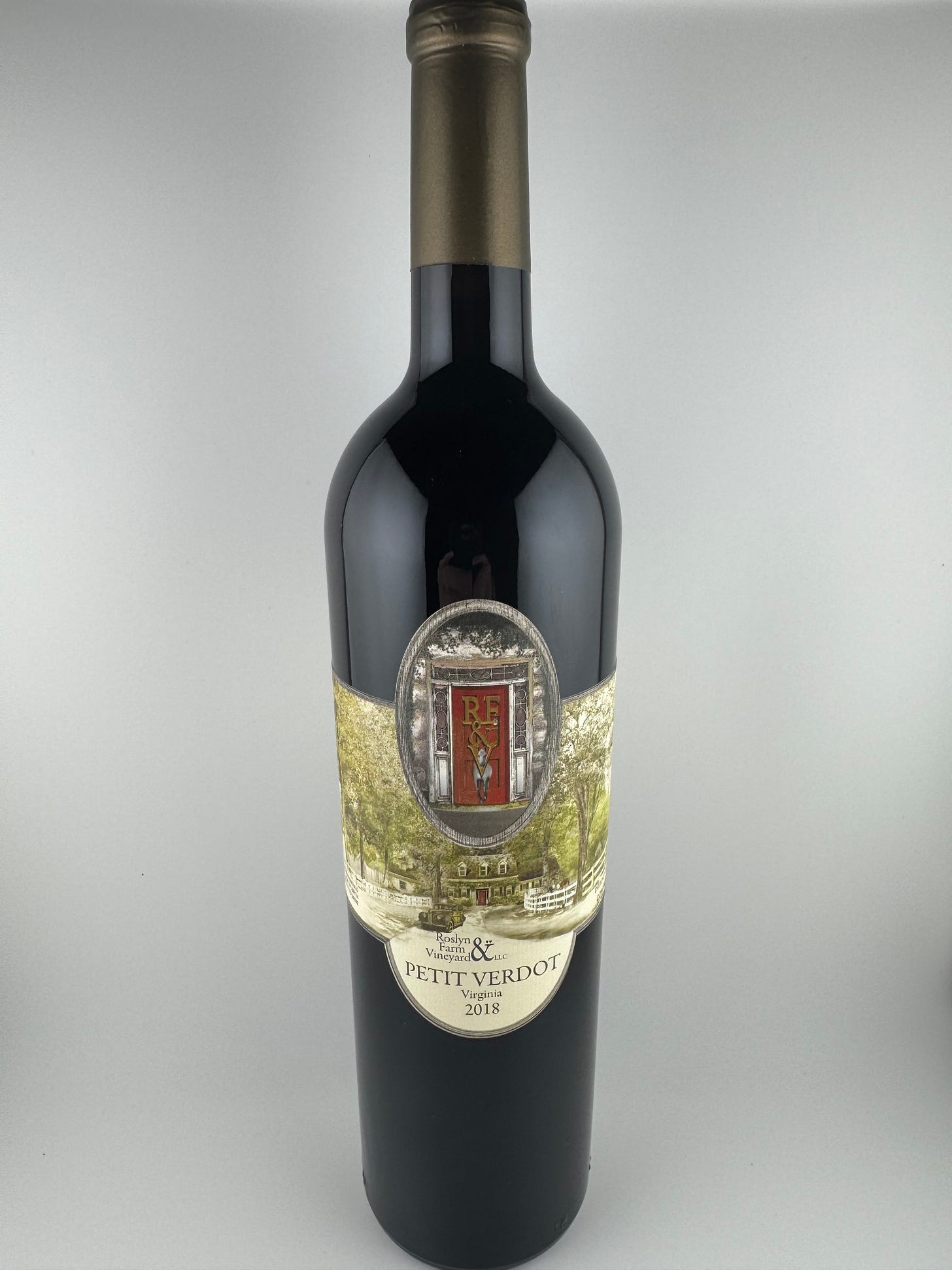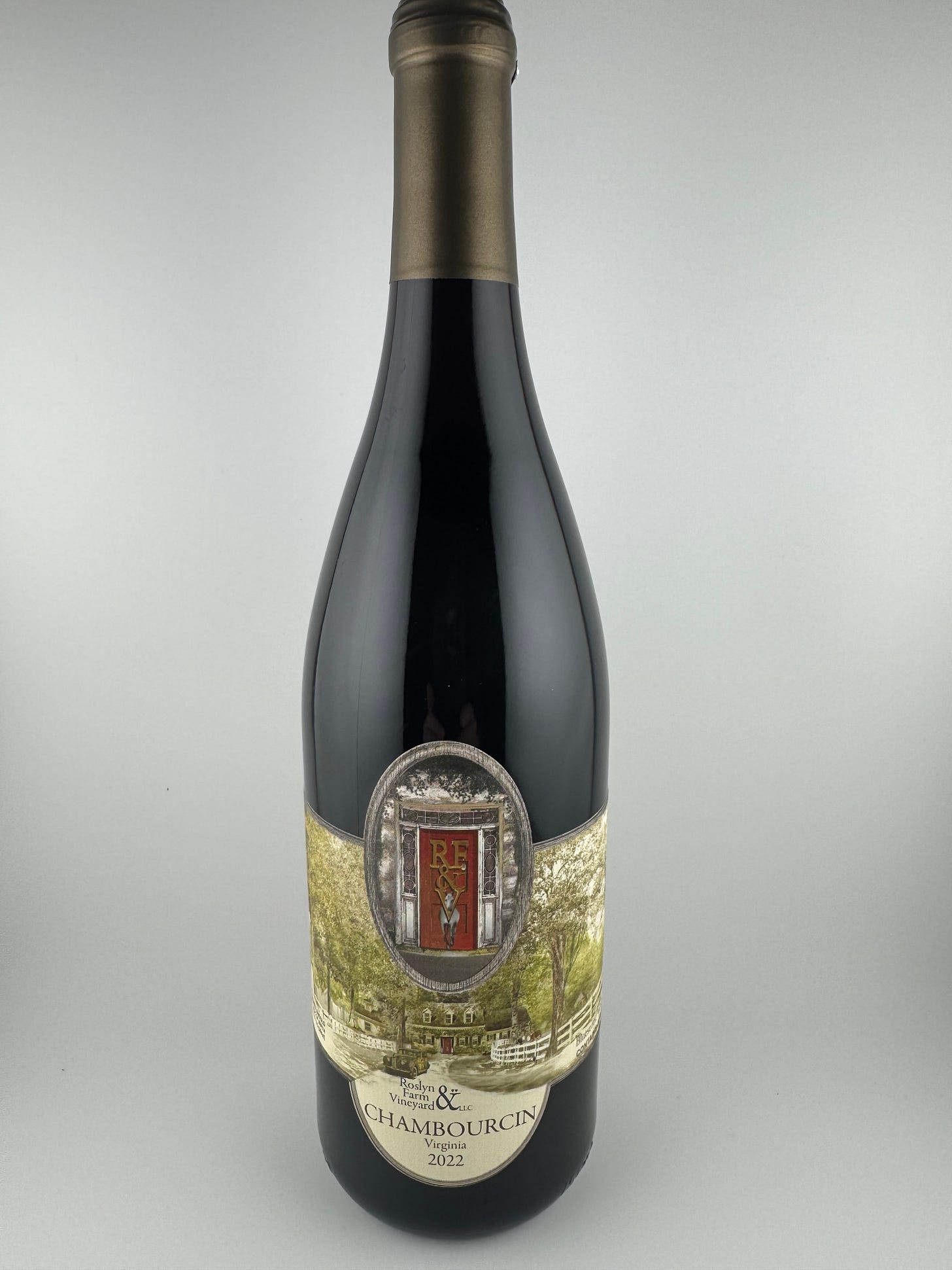 Here is my illustration of Roslyn Ridge Farm and Vineyard. It is created to give a visual tour of the beautiful property in a single panoramic view, and is the background image for their wine labels, shown below. — Illustration by Bob Kirchman