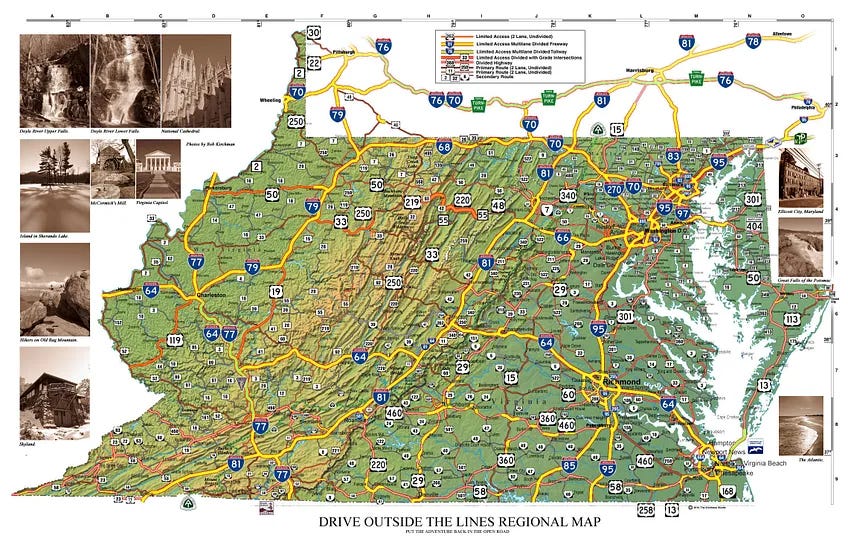 Remember when filling stations passed out free paper maps. Here’s our regional map for travel and exploration. Spring is coming, and I remember road trips in mom’s VW microbus. We’d go to places like Gettysburg and climb into sniper’s nests from Civil War days. We must have explored every cavern in Virginia.