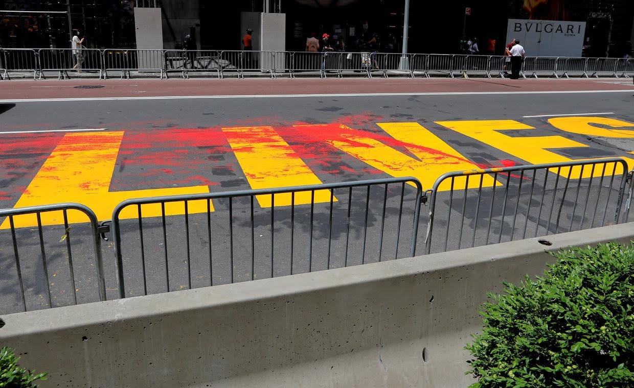 Here block letters on a street protest police violence — but their ‘vandalism’ by people concerned about the harm ‘defund the police’ will do to their communities creates a composition in its own right.