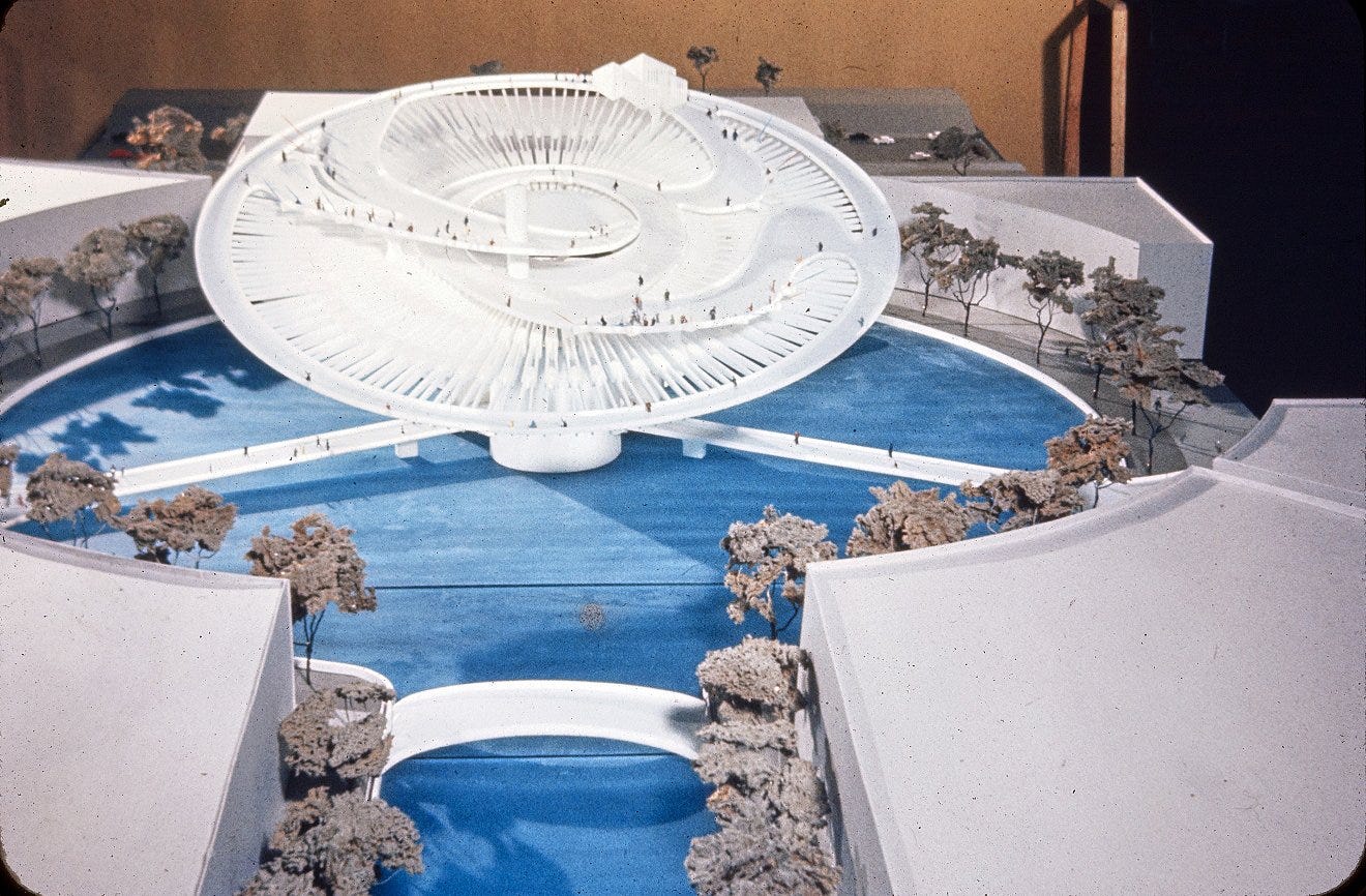 Rudolph’s design is prepared for the Portland Cement Association and features a giant 160-foot high 340-foot in diameter, saucer-shaped concrete structure with stations for star viewing and tilted at an 18-degree angle to offer an optimum view of the heavens held up by two curved walls rising from a circular lagoon. Visitors are lifted to the center of the “saucer” by escalators and elevators inside the curved supporting walls. From the central ring they would walk outward over curved ramps to a constantly moving sidewalk on the disc’s outside perimeter. A stage is projected from one of its two supporting walls and a restaurant, planetary viewing station and other educational or recreational features can be located at points along the top surface to make it an entertainment center.